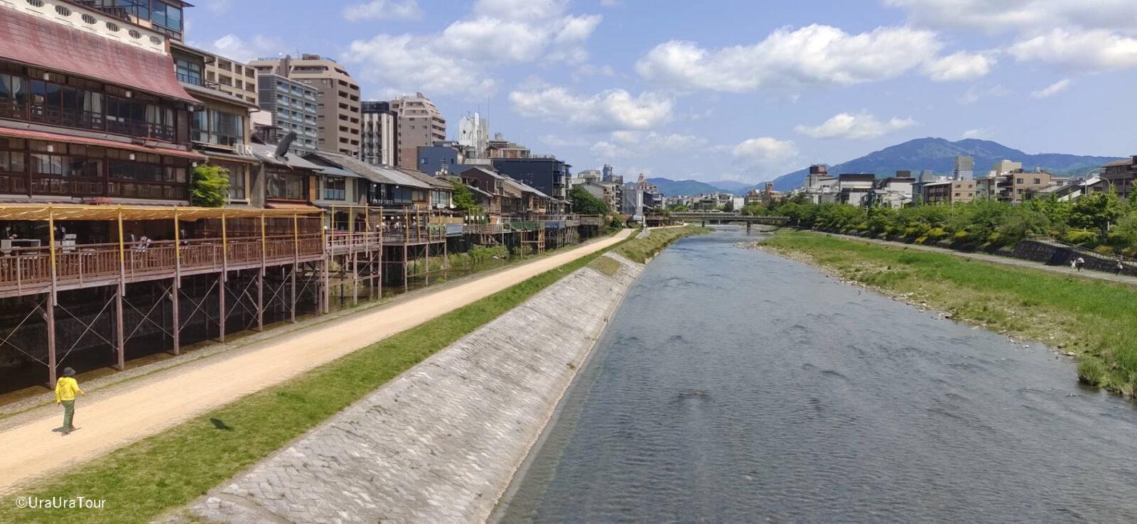 道中差し掛かった鴨川には、夏の風物詩の納涼床が早くも建てられていました。